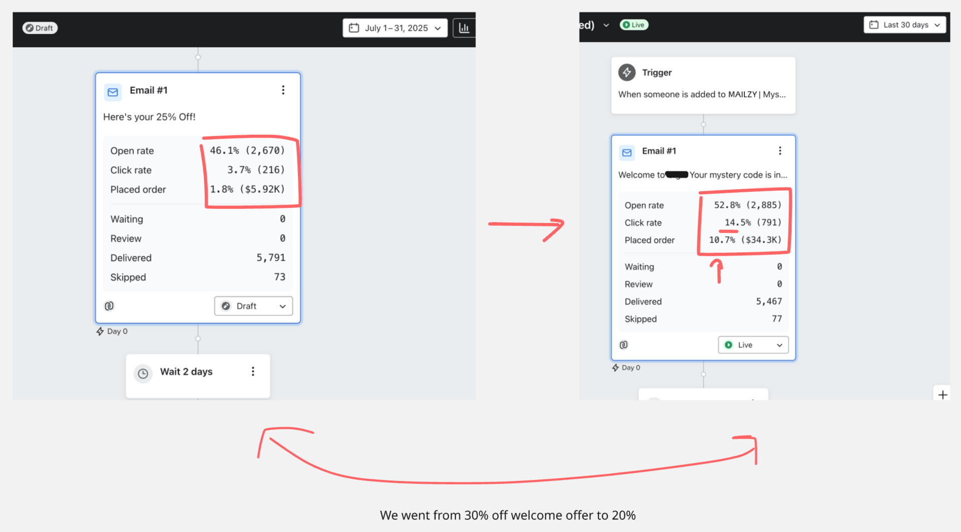 The difference was insane and we didn’t expect it to be this drastic… we cut down from 30% off to 20% off and not only increased margins but also ultimately increased revenue by 7x with the SAME amount of people going through.